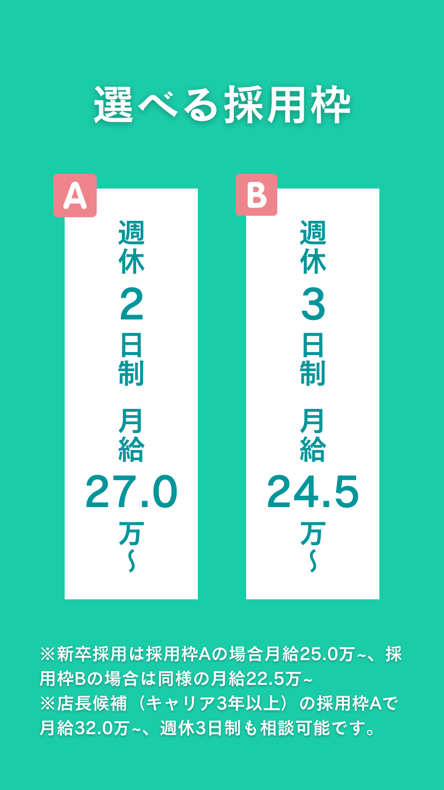 「選べる2つの採用枠」 【A】週休2日制 採用枠 ▶︎月給270,000円+各種手当 (各種手当:賞与+その他手当+交通費全額etc..) (新卒採用枠は月給250,000円スタート) (店長候補採用枠は月給320,000円スタート) ▶︎月間8日〜9日休み (年間休日105日+別途有給休暇あり) 【B】週休3日制 採用枠 ▶︎月給245,000円+各種手当 (各種手当:賞与+その他手当+交通費全額etc..) (新卒採用枠も同条件) (店長候補採用枠は月給255,000円スタート) ▶︎月間12日休み(年間休日144日+別途有給休暇あり) ※面接時に【A】【B】ご希望の採用枠をお伺いします。 ーーーーーーーーーー ・試用期間:1ヶ月〜2ヶ月 ・研修中時給 1300円 ※ホームページからの応募特典(通常は1200円です) ・昇給あり(年2回・当社規定の評価制度に沿って昇給します) ・賞与あり(年3回・全体業績と個人業績に沿って支給) ・アニバーサリー手当(3年ごとに30万円特別賞与支給) ・交通費全額支給(上限なし) ・物販手当あり(ノルマは無いです) ・役職手当あり ・1人暮らし応援制度(住宅手当) ・社会保険完備(入社1ヶ月目の研修中から社会保険完備◎) ・雇用保険, 労災保険完備 ーーーーーーーーーー ▼【A】週休2日制 採用枠 給与例▼ 1年目:月給270,000円+賞与20,000円=合計290,000円 2年目:月給300,000円+賞与40,000円=合計330,000円 3年目:月給330,000円+賞与80,000円=合計410,000円 ※歩合還元もありますが、基本給比率が高い給与システムの為、集客状況によっての収入の増減の心配はありません。 ※上記に別途物販手当10%や交通費全額支給がプラスされます。 ▼【B】週休3日制 採用枠 給与例▼ 1年目:月給245,000円+賞与20,000円=合計265,000円 2年目:月給255,000円+賞与30,000円=合計285,000円 3年目:月給265,000円+賞与40,000円=合計305,000円 ※歩合還元もありますが、基本給比率が高い給与システムの為、集客状況によっての収入の増減の心配はありません。 ※上記に別途物販手当10%や交通費全額支給がプラスされます。 |