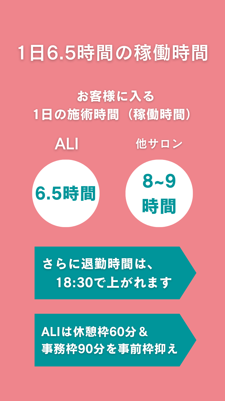 ■9:30〜18:30(採用時はこちらが前提です) ■10:00〜19:00(給与等級による) ▼POINT▼ ※9:30〜18:30の勤務時間の中で、 【休憩時間60分】+【事務作業時間30分】+【事務作業時間30分】+【事務作業時間30分】=合計【2時間30分の事前枠閉じ】を行っています。 →結果的に1日の出勤の中で、予約受付時間(施術時間)が【最大6時間30分】となります。 ※10:00〜19:00の勤務時間は、業務に慣れた後に、昇給・昇格した際に選択できる給与等級となります。 ※業界では珍しいですが、ご予約に合わせて休憩を取るのではなく、歯科医院のように事前に休憩枠を確保いたします!「ランチが夕方になった...」というようなことがない環境を整えています! |