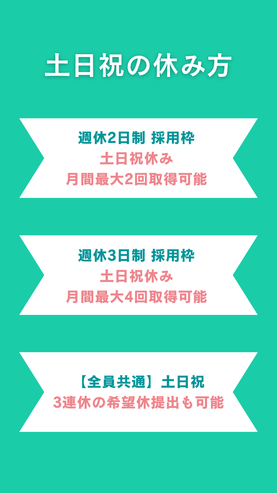 【A】週休2日制 採用枠 ▶︎月間8日〜9日休み(年間休日105日+有給休暇) ▶︎土日祝休み:月間最大2回取得可 【B】週休3日制 採用枠 ▶︎月間12日休み(年間休日144日+有給休暇) ▶︎月間で2連休以上を複数回取得可 ▶︎土日祝休み:月間最大4回取得可 【共通】 ■毎月3連休取得可 ■リフレッシュ休暇:4〜5連休取得可(年2回まで) ■ステップ休暇:14日〜最大28連休取得可(勤務3年ごと) ■クリスマス休暇(12/25定休) ■希望休3日までOK(土日祝最大2回まで) ■有給休暇 ■年末年始休暇 ■慶弔休暇 ■産休育児休暇制度(取得実績有) |